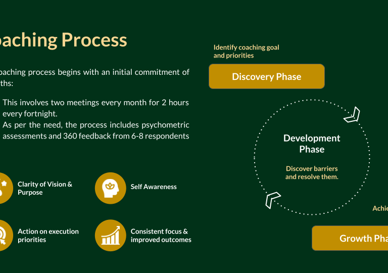 Coaching is an ongoing powerful dialogue between the coach & the leader. The key objective is to unlock the growth potential and empower leaders to overcome barriers towards achieving their goals.